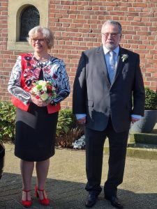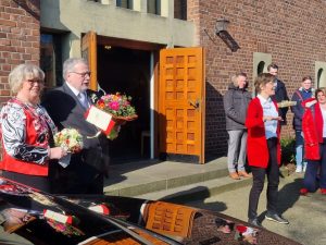 Am Samstag, den 5. März fand morgens um 10.oo Uhr die Dankmesse für das Goldhochzeitspaar Christa und Klemens Wissing statt. Ein Ensemblechor aus Mitgliedern des KAB Chores und des Piuschores umrahmten den Gottesdienst. Jeweils bestimmte Lieder aus den jeweiligen Chören in denen ja beide Mitglied sind und der anschließende Schlußgesang draußen mit noch Mitgliedern aus beiden Chören machten die Überraschung perfekt. Monika nach langer Krankheit wieder hergestellt lies es sich nicht nehmen diese Messe und das Ständchen zu dirigieren.